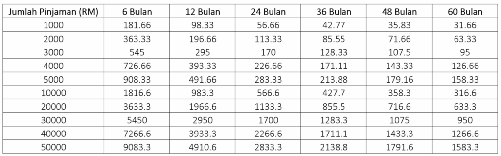 Pilihan pinjaman kami disesuaikan mengikut kemampuan anda, dengan tempoh bayaran balik yang fleksibel dari 90 hari hingga 60 bulan (5 tahun), dan kadar faedah tahunan antara 10% hingga 16%.